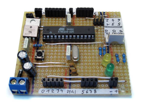 That was the first Arduino clone made with a protoboard. It's based on the Arduino NG (Nuova Generazione). And was inspired by the Arduino Single-Sided Serial Board. The bootloader was burned with a parallel programmer and the board was programmed with an C-Controll USB to Serial adapter.